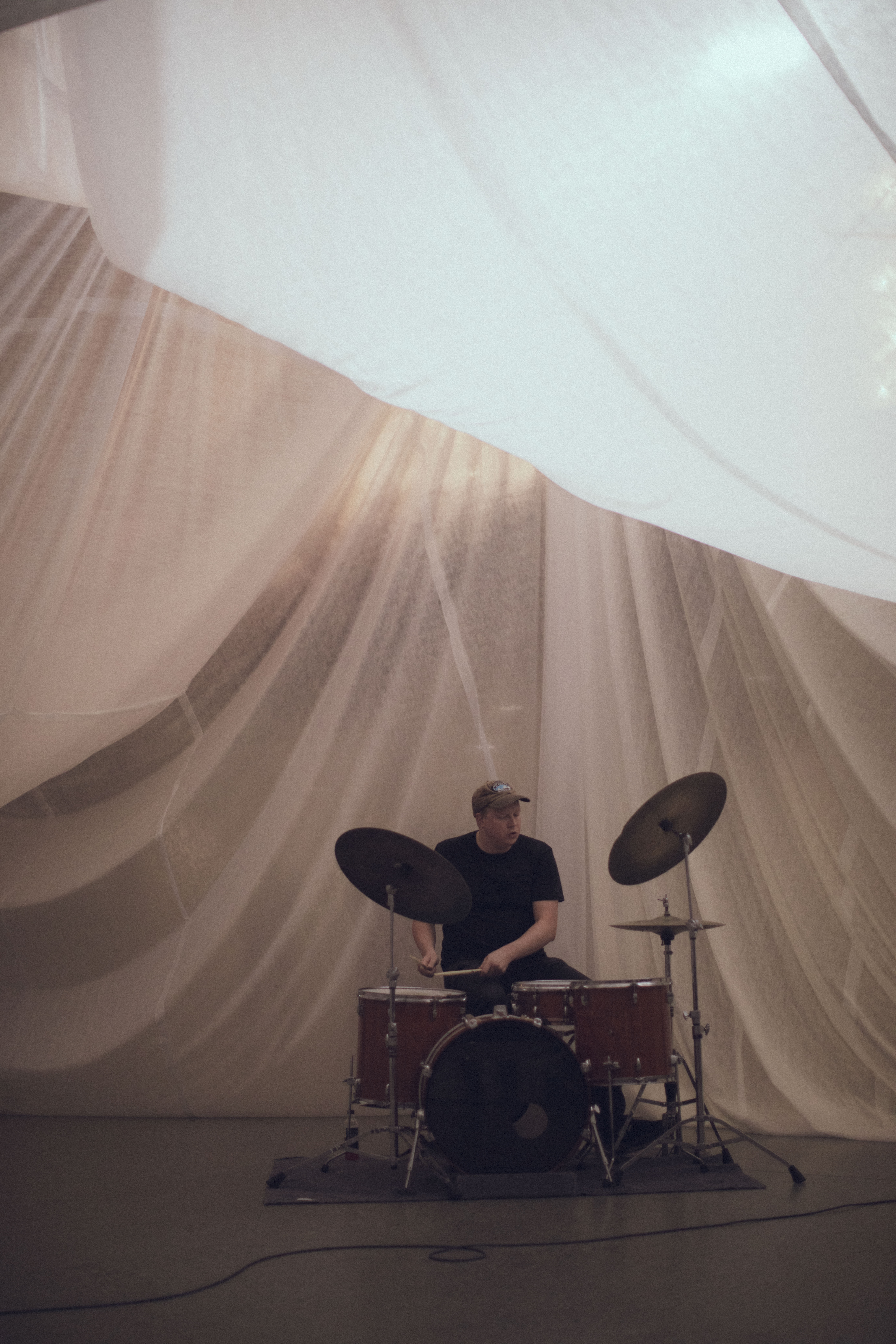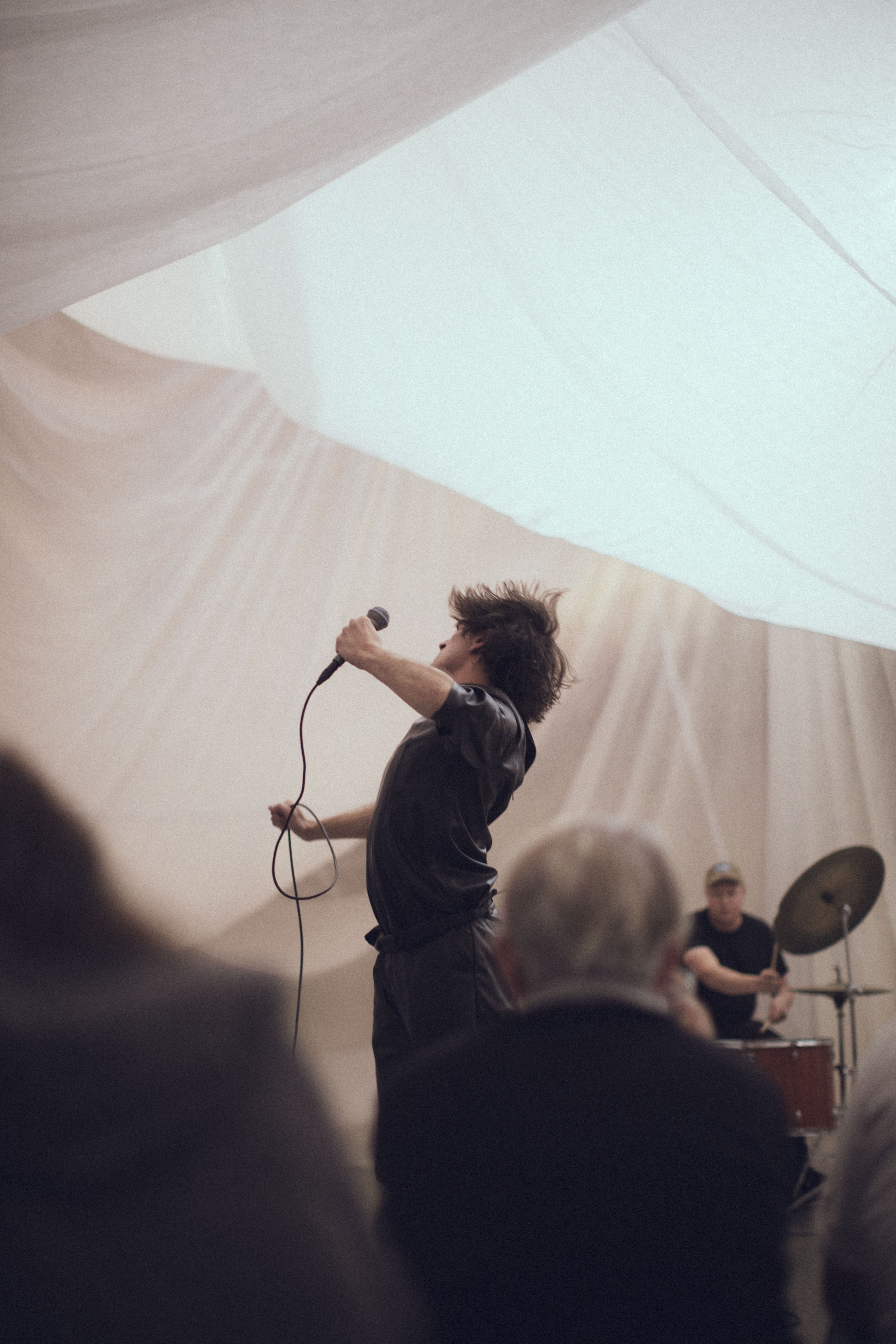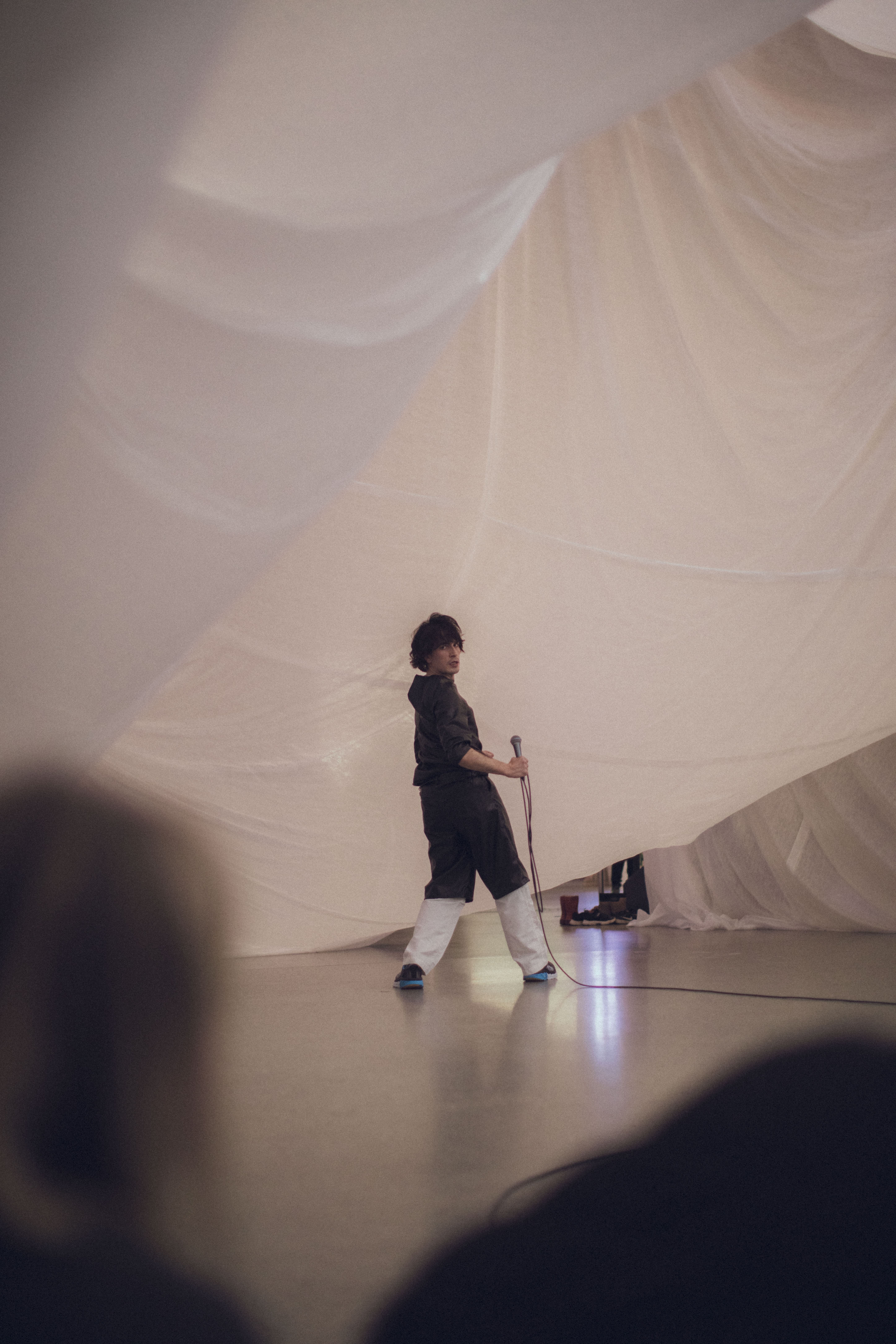 A meeting between dance artist Jonas Øren and musician Hans Uhre in the room installation SOFT SPACE by architect and artist Mio Ueno Oribe Stuberg.